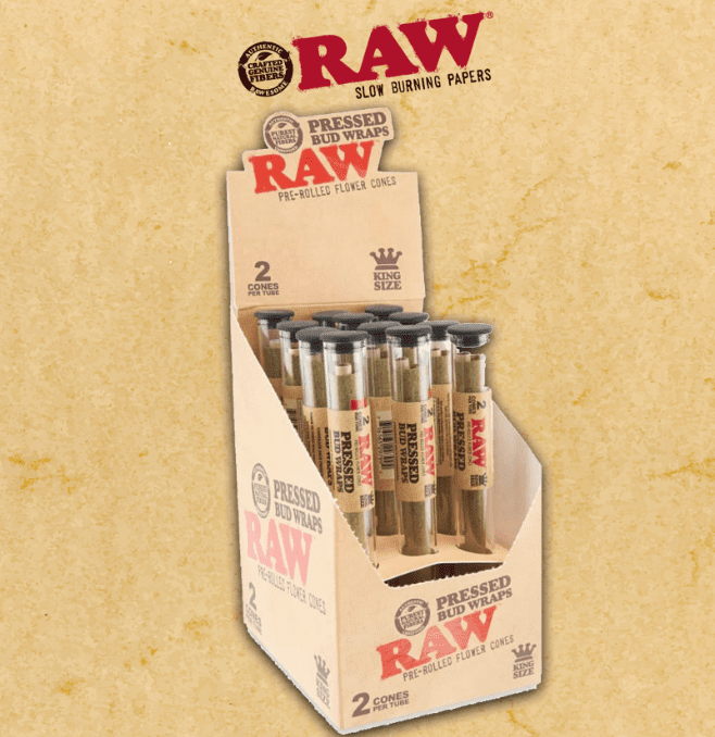 RAW PRESSED BUD WRAP CONE (KING SIZE) 2PK – 12CT DISPLAY. The RAW Pressed Bud Wrap is the perfect way to enjoy your favorite herbs on the go! These pre-rolled cones are made with RAW’s signature unrefined, naturally processed tips and are filled with a blend of dried herbs and spices. Each cone is 3 inches long and has a king size circumference. The RAW Pressed Bud Wrap Cones come in a pack of 2 and are available in a 12-pack display.