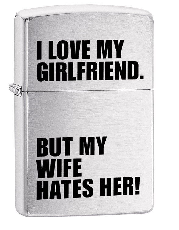 Add bold humor and edgy novelty to your lighter lineup with the Zippo “I Love My GF. But My Wife Hates Her!” Lighter, a hilarious windproof Zippo lighter featuring a cheeky, adult-humor slogan that instantly grabs attention and drives impulse sales. Perfect for customers who love sarcastic, outrageous, and conversation-starting designs, this lighter blends eye-catching comedy with Zippo’s legendary reliability. A proven fast-mover for smoke shops that thrive on novelty and statement pieces.
